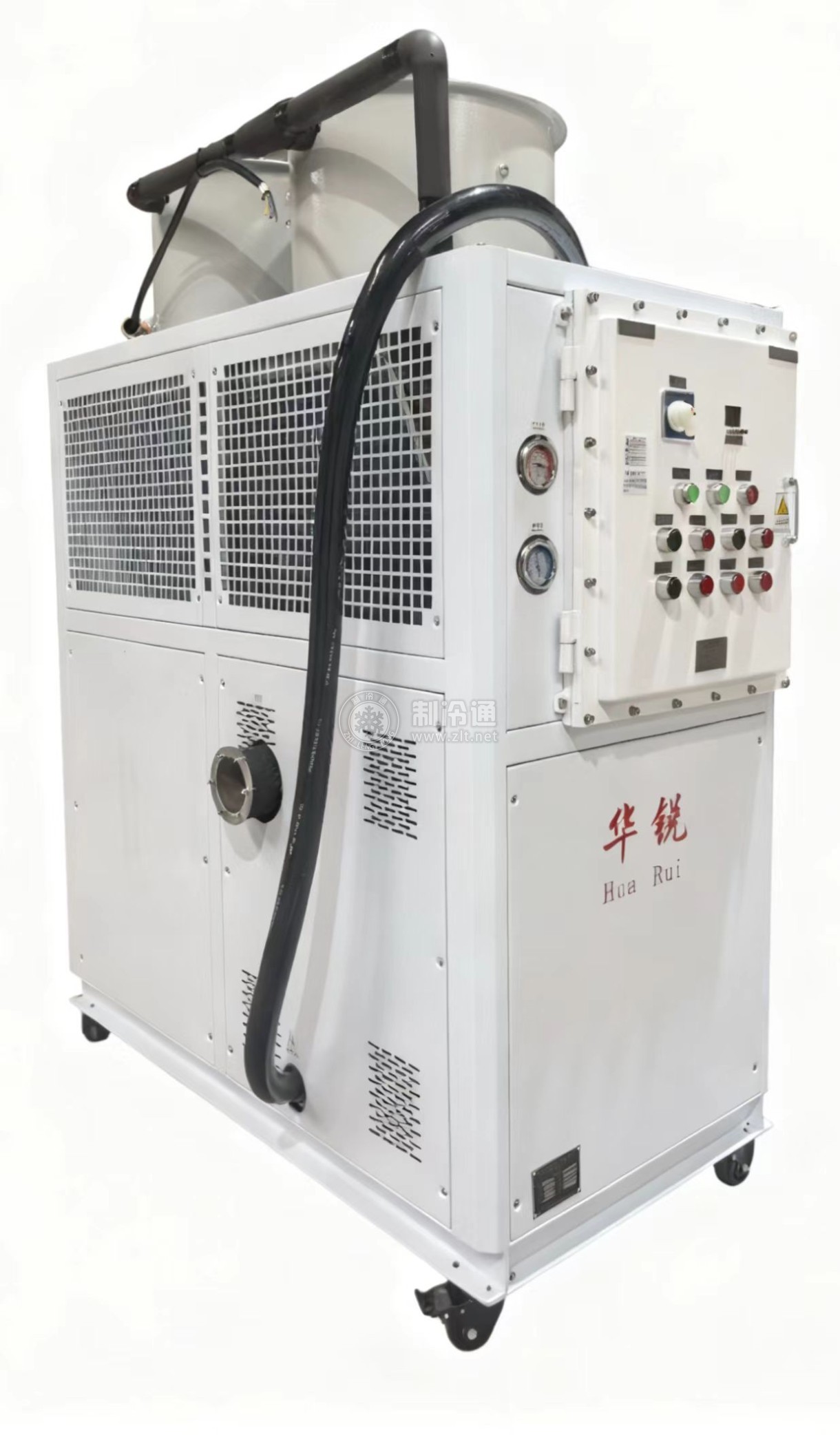 防爆型冷风机组各组件均按国家防爆标准制造,防爆主要控制器根据GB3836.1-2000《爆炸性气体环境用电气设备通用要求》、GB3836.2-2000《爆炸性气体环境用电设备隔爆型“d”》和GB3836.3-2000《爆炸性气体环境用电气设备增安型“e”》的规定而设计制造,能够满足特殊环境要求。 华锐防爆冷风机组适用范围: 1、爆炸性气体混合物危险场所:1区、2区。 2、爆炸性气体混合物:ⅡA、ⅡB、ⅡC。 3、温度组别:T1-T4。 4、防爆等级为:EXdmibⅡBT4; 特种制冷设备防暴冷风机组主要特点: 1、防爆冷风机组采用半封闭双螺杆压缩机或全封闭涡旋式压缩机,节能、高效、稳定,其具有运动部件少,稳定、高效、故障率低等特点; 2、防爆型冷风机组主要部件均为丹佛斯Danfoss、ALCO、Emerson、Carly等*品牌元件,采用西门子Siemens工业级PLC可编程控制器,大屏幕液晶显示界面;自动/手动切换,自动化程度高; 3、防爆冷水机组提供从制冷剂系统、电控系统、空气处理系统的保护,完全确保机组安全正常地运行。压缩机设置电机过热、过电流、相序异常、油位过低、低压、高压等保护;具有高效、节能、稳定、安全等特点;