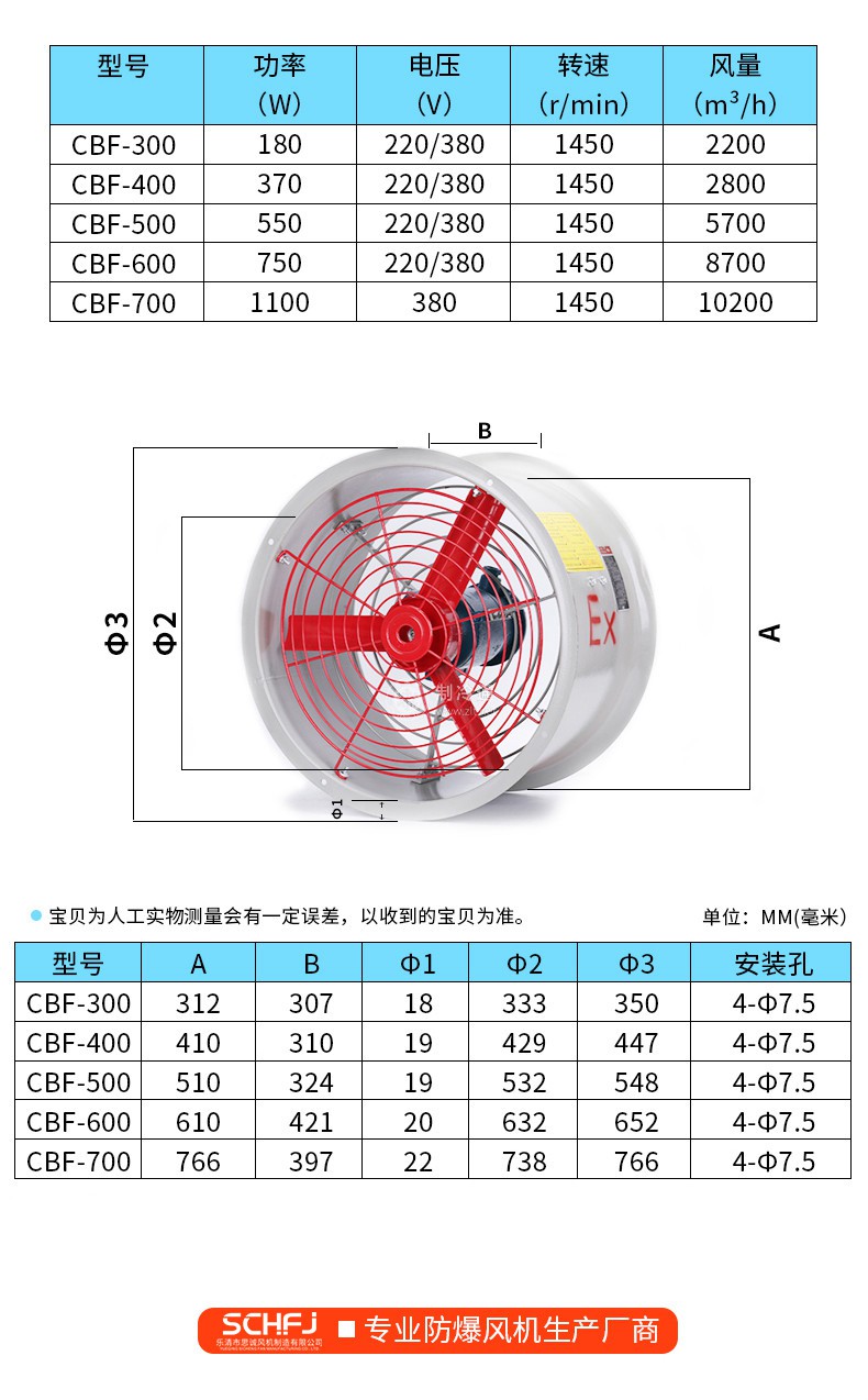 防爆轴流风机 CBF-400 功率:0.37kw 风量:2880m³/h 转速:1450r/min