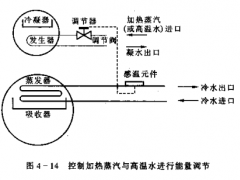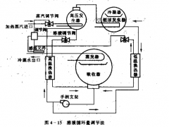 图13-17为双效烟气型溴化锂冷热水机组的循环流程。在制冷工况下,按双效循环流程工作。以冷剂水的蒸发制冷,通过溶液的质量分数在吸收和发生过程中的变化,实现冷剂水的制冷循环。在制热工况下,以冷剂蒸汽的冷凝热制取热水,通过溶液的质最分数在发生过程和稀释过程中的变化,实现冷剂水的制热循环。