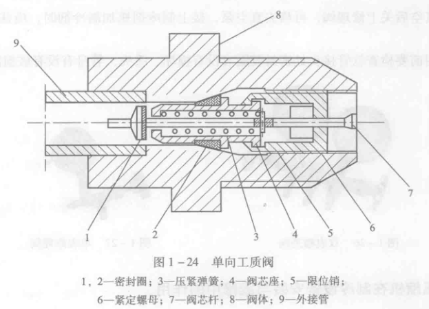 单向工质阀安装在制冷系统的管道中,如工艺管、回气管和高压管等,起测量压力、补充工质和排放空气等作用。单向工质阀由阀体、阀芯组件和外接管等组成,如图1-24所示。