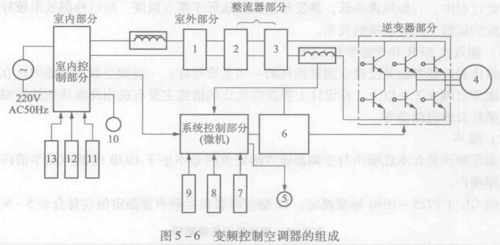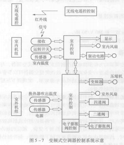 1、变频控制空调器的组成:变频控制空调器室内机部分主要由室内控制器、遥控器、传感器、显示器和室内风机电动机驱动回路等组成;室外机部分由微机、整流器、逆变器、电流传感器、室外风机电动机和阀门控制器等组成,如图5-6所示。