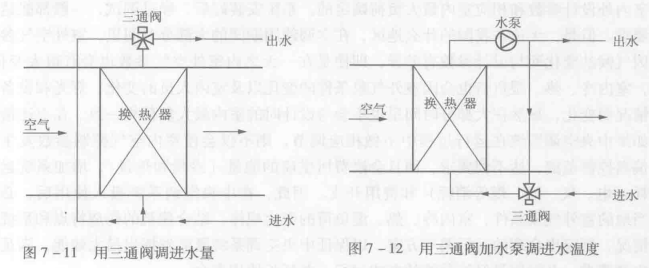 表冷器或盘管的进出水流量可以采用直通阀或三通阀来调节。使用直通阀造价低,管路筒单,但在调节水量时,由于干管流量要发生相应变化,会影响同一水系统中其他表冷器或盘管的正常工作,此时可以在供水管路上加装恒压或恒压差的控制装置来避免产生相互干扰的现象。使用三通阀(如图7-11所示)则可以达到理想的效果,但其造价要比用直通阀高,管路也要复杂一些。