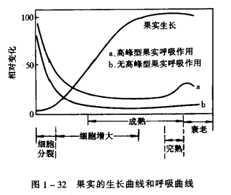 许多果实的花后幼果具有相当高的呼吸强度,以后随着果实的生长,呼吸强度逐渐减弱,当果实增长到较大值时呼吸强度突然上升,达到高峰值后又呈下降趋势,直至果实衰老腐败。