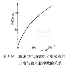 ②减速型。减速型结构如图5.45所示。减速型电动式电子膨胀阀内装有减速齿轮组。发步进电动机通过减速齿轮组5将其磁力矩传递给阀针4。减速齿轮组起放大磁力矩的作用,因而配有减速齿轮组的步进电动机可以方便地与不同规格的阀体配合,满足不同调节范围的和需要。减速型电动式电子膨胀阀的开度特性见图5.46。