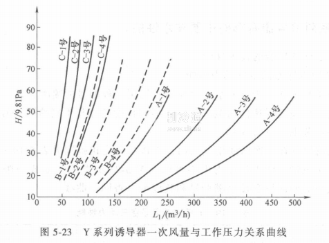 Y系列诱导器在一次风使用范围内,若求诱导器在某一个一次风量下的工作压力大小可以查图5-23的曲线。立式与卧式诱导器不论单面回风与双面回风都按喷嘴型号和长度型号查同一曲线。