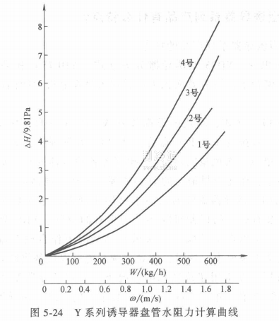 Y系列诱导器盘管水阻力 Y系列四种长度诱导器单个盘管在某一流量下的水阻力计算如图5-24所示。