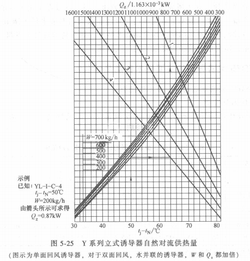 Y系列诱导器盘管热工性能 Y系列立式诱导器自然对流供热量的计算如图5-25所示。