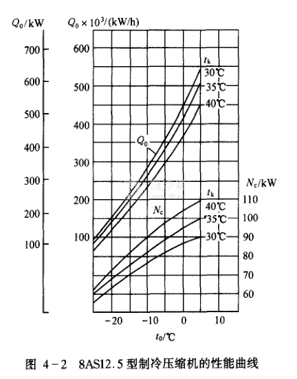 (3)当冷间热负荷变化较大时,应充分利用制冷压缩机的容积提高制冷压缩机的制冷量。通过制冷压缩机的性能曲线(图4一2)可以看出,当冷凝温度不变时蒸发温度越高则制冷量越大。当冷间由于货物的热量增大而使库温上升时,蒸发温度与冷间温度的温差增大,使制冷剂蒸发温度剧烈上升(特别是冻结间有时会从一30℃升到一18℃左右),这时应将双级压缩机改为单级压缩机而进行降温,提高制冷压缩机的制冷最。待冷间温度降低后再改换成双级压缩机。