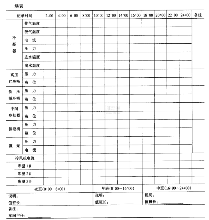 运行记录的基本格式见表4一6,使用时可根据实际情况进行修改。运行记录一般每2h记录一次,记录下每个班次中制冷压缩机、氨泵、冷风机等运行设备的开、停时间,记录各制冷压缩机和设备的工作温度、压力状况及其他参数。每班工作结束时,必须填写电表和水表的指示值,并将本班使用的各种材料消耗最填人运行记录,以便月终计算各种消耗。交班时必须填写交接班记录,明确交待工作进程、任务、设备状态及注意事项等。
