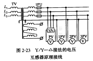 b.采用二个单相电压互感器接成V形的接线,仪表和继电器接L1~L2; L2~L3与两个线电压,用于主接线较简单的变配电所。原理接线如图2-22所示。