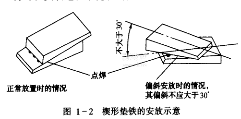 制冷机安装过程中,使用各种垫铁、垫块来调整设备的水平度。垫铁、垫块常用铸铁或钢板制成。厚垫铁多用铸铁,薄垫铁多用钢板。制冷机安装中多用斜、平垫铁,一般垫铁放置在设备的底部(特别是螺栓处)。楔形垫铁的安放方法如图1一2所示。