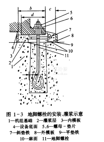 制冷机初平后,用不低于基础标号的细石混凝土或水泥砂浆对地脚螺栓孔进行二次灌浆。各孔洞灌浆必须一次完成,分层捣实。水泥初凝后应洒水养护,室温不得低于5℃,时间不得少于7d(见表1一2)。地脚螺栓的安装、灌浆方法见图1一3(图中a,b,c,d是安装制作尺寸,详细略)。