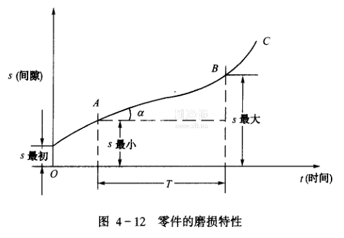 图中的月月段曲线表示工作磨损阶段,这时的磨损应为正常工作磨损。这一阶段中的磨损过程十分平稳,时间T表示零件的使用期限。零件使用期限的后期,磨损过程将逐渐加快,当磨损量增至B点的磨损值时,零件的磨损就超出了正常工作磨损阶段。