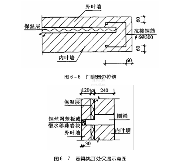 第二,门窗洞口边,外叶墙应设阳搓与内叶墙搭接(图6-5),且应沿竖向每隔300mm设置拉结钢筋(图6-6)。