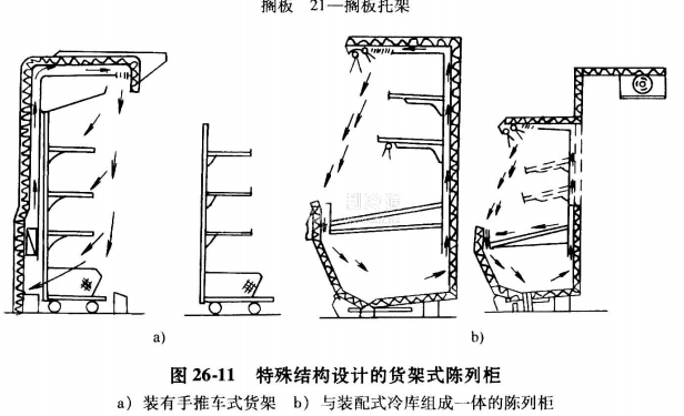 货架式陈列柜可以有效地展示商品,方便顾客选购,并能保持商品陈列的低温环境,是目前商业超市中应用较多的陈列柜。为了商业陈列的使用要求,货架式陈列柜可以有许多不同的结构设计,图26-11 a所示为装有手推车式货架的分体式陈列柜。它具有一固定的柜体和冷风吹送系统。当把装好商品的货架推入柜体冷风区,即可实现商品的低温陈列和贮藏,方便销售,灵活进货。图26-11 b所示为一种适合小型食品店的货架式陈列柜,它与装配式冷库组成一体。货架陈列柜与冷库同由一个制冷系统供冷,有效地利用空间,冷却性能好,冷量得到充分的利用,冷库内的商品可以随时向货架补充,使用效率高。