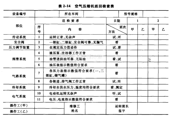 表2-14为空气压缩机的巡回检查表实例。