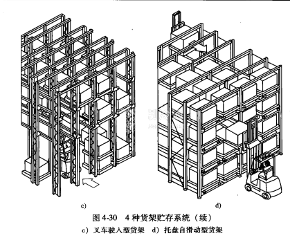 托盘货架贮存系统是影响冷库物流功能的重要因素,每一冷库按其经营特点、要求、物流种类不同,可选择不同的托盘货架贮存系统。表4-23列出8种典型贮存系统货架的特点和应用,图4-30是其中4种类型的货架贮存系统示意图。